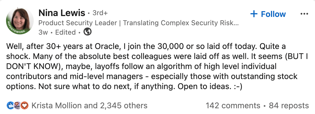 G'day G'day friends, Oracle laid off 30,000 staff over email at 6:00 am on a Monday morning. Even after working at Oracle for 34 years, Nina was let go via email: here was no warning or even help to get another job. No thank you or loyalty. Oracle really said: “F YOU. Goodbye and good luck.” I take no pleasure in writing an email like this. But this is the reality of the job market. Here’s what you can do if you’re in Nina’s position: 1/ Take one high-value skill: It can be: Sales. Coding....